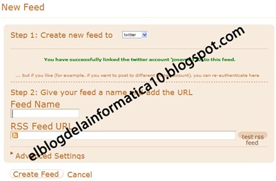 Esto lo haremos a través del feed de nuestro blog y la página Twitterfeed, que lo que hará será actualizar directamente nuestro Twitter con cada nueva entrada de nuestro blog.